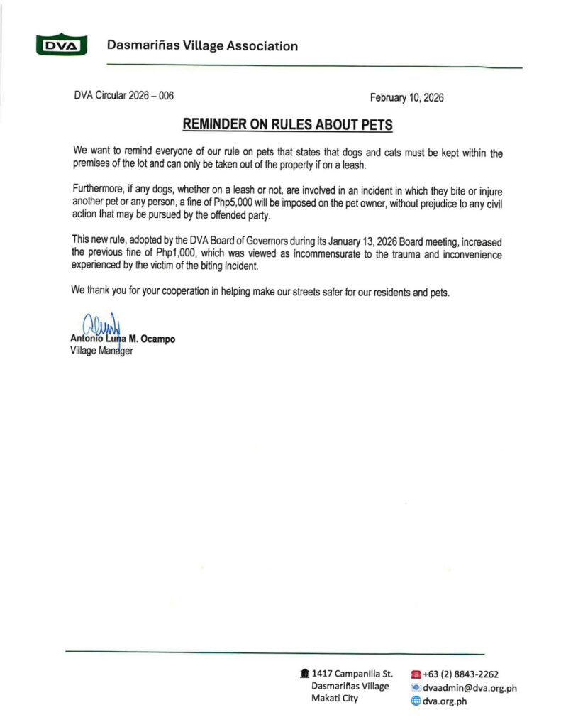 Circular 2026-006 – Reminder on Rules About Pets