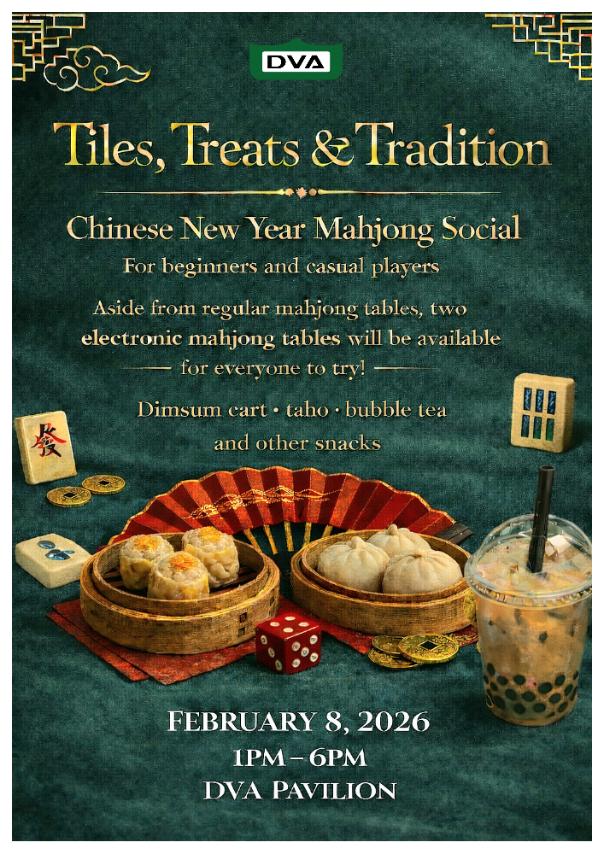 Events Tiles, Treats & Tradition January 16, 2026 New Year Park Fest December 29, 2025 Christmas Tree Lighting November 27, 2025 Christmas Decorating Contest November 25, 2025 Fire Awareness Seminar November 17, 2025 A Christmas Affair October 22, 2025 Holiday Craft Fair September 25, 2025 DVA Halloween House Decoration Contest September 15, 2025 Joint DVA-Barangay Dasmariñas Blood Drive September 1, 2025 Happy Chinese New Year! January 28, 2025 DVA Diamond Jubilee Celebration January 10, 2025 Invitation to DVA Diamond Jubilee Celebration on January 18, 2025 January 3, 2025 1 2 3 4 5 6 Next »